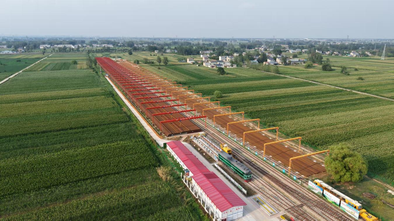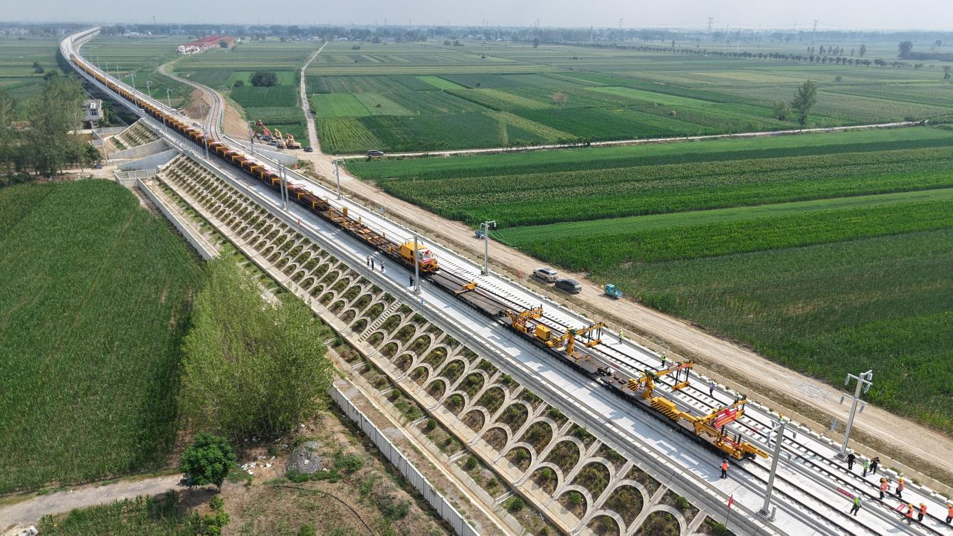 铺轨作业引进、应用国内最先进的CP500Z本邻双线铺轨机组,其具有铺设速度快、安全性能好、精度高等优势,可实现单线铺轨、跨线铺轨及左右线同时铺轨,单日最快单线铺轨进度可达9公里。按计划,全线铺轨任务将于今年10月底完成。
