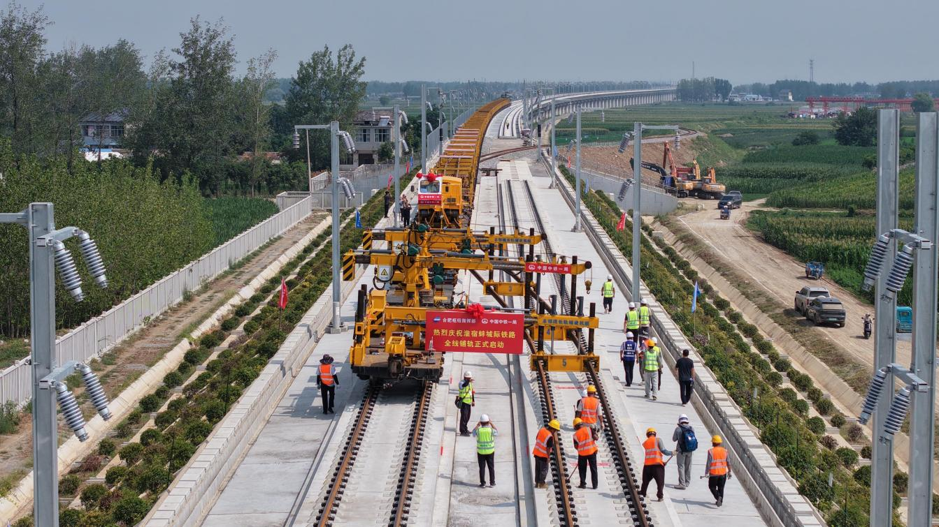 8月6日上午,在安徽省淮北市濉溪县双堆集高铁站内,随着作业人员操作着本邻双线铺轨机,将首对500米长钢轨平稳铺设在无砟轨道上,新建淮北至宿州至蚌埠城际铁路(简称淮宿蚌城际铁路)铺轨施工正式启动。