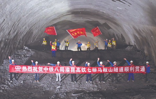 经过1280天的不懈努力,5月1日,中铁八局承建的渝昆高铁川滇段控制性工程马鞍山隧道贯通。该隧道位于宜宾市筠连县境内,全长4471米,为单洞双线高瓦斯隧道,全隧以砂岩、泥岩为主,主要不良地质为岩溶、煤层瓦斯及有害气体,加上富水段、断层处泥岩遇水软化后多次引发隧道变形,给工程建设带来极大困难。 李涵 摄